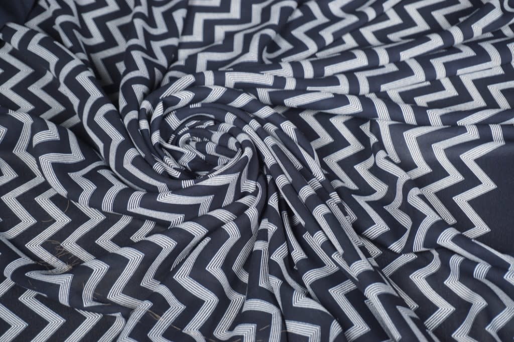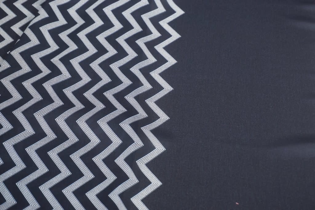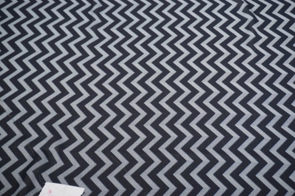 Een prachtige crêpe- voile in donkerblauw met een zigzagmotief dat verticaal over de stof loopt. De stof is weliswaar 160cm breed maar heeft aan beide stofvouwen een effen strook van ongeveer 20cm breed. Effectief is de breedte daardoor 140cm... Lees meer