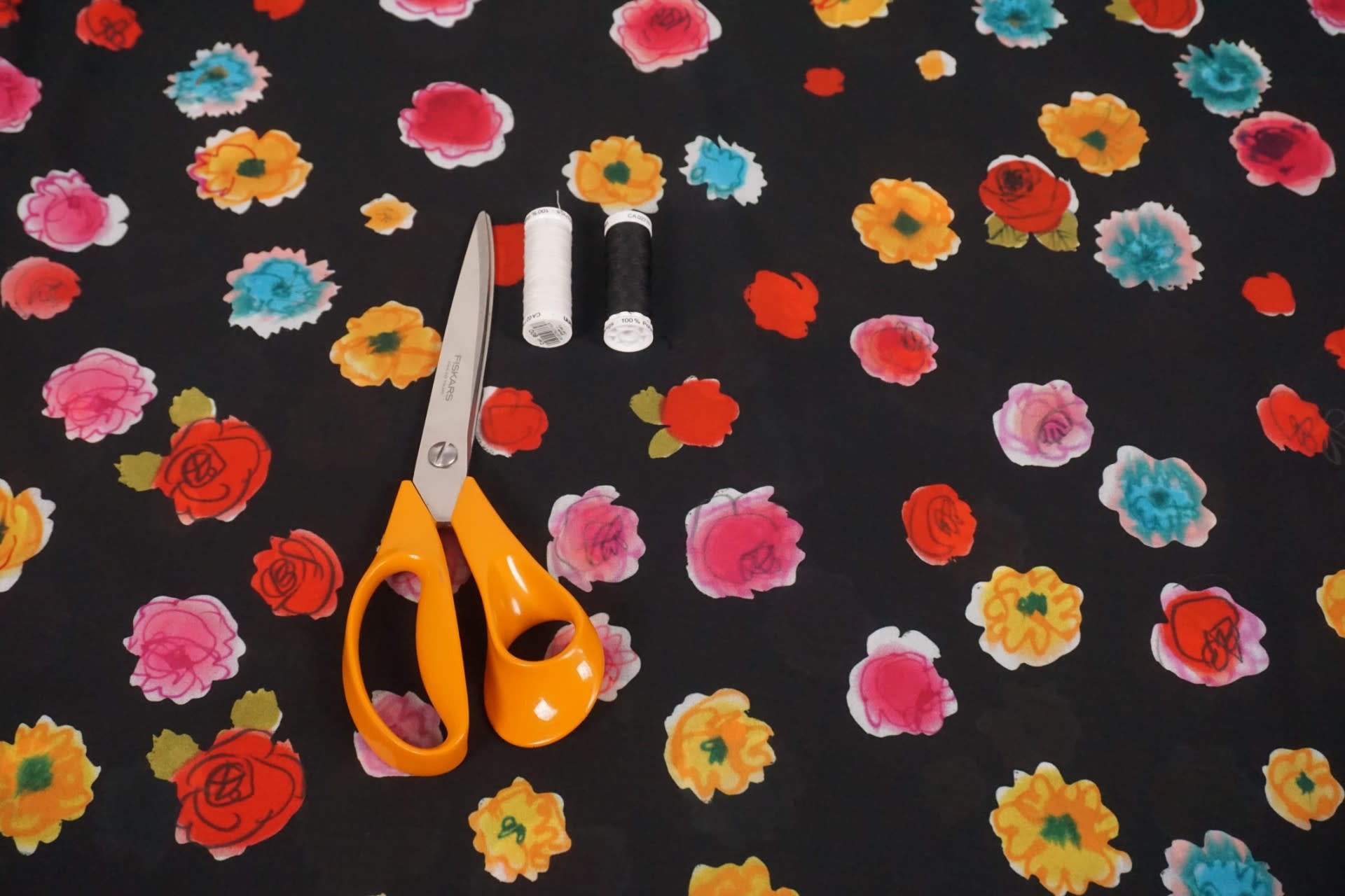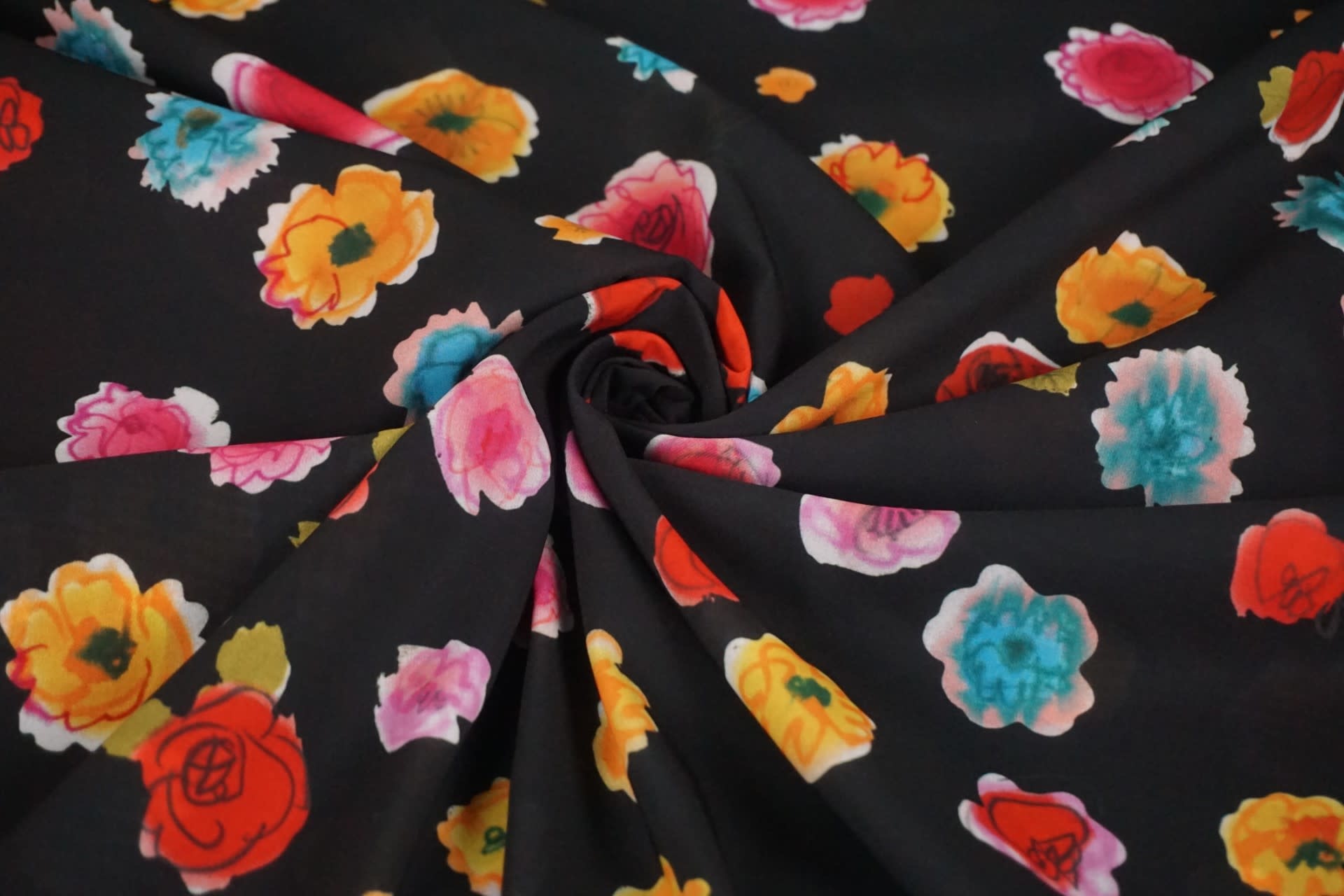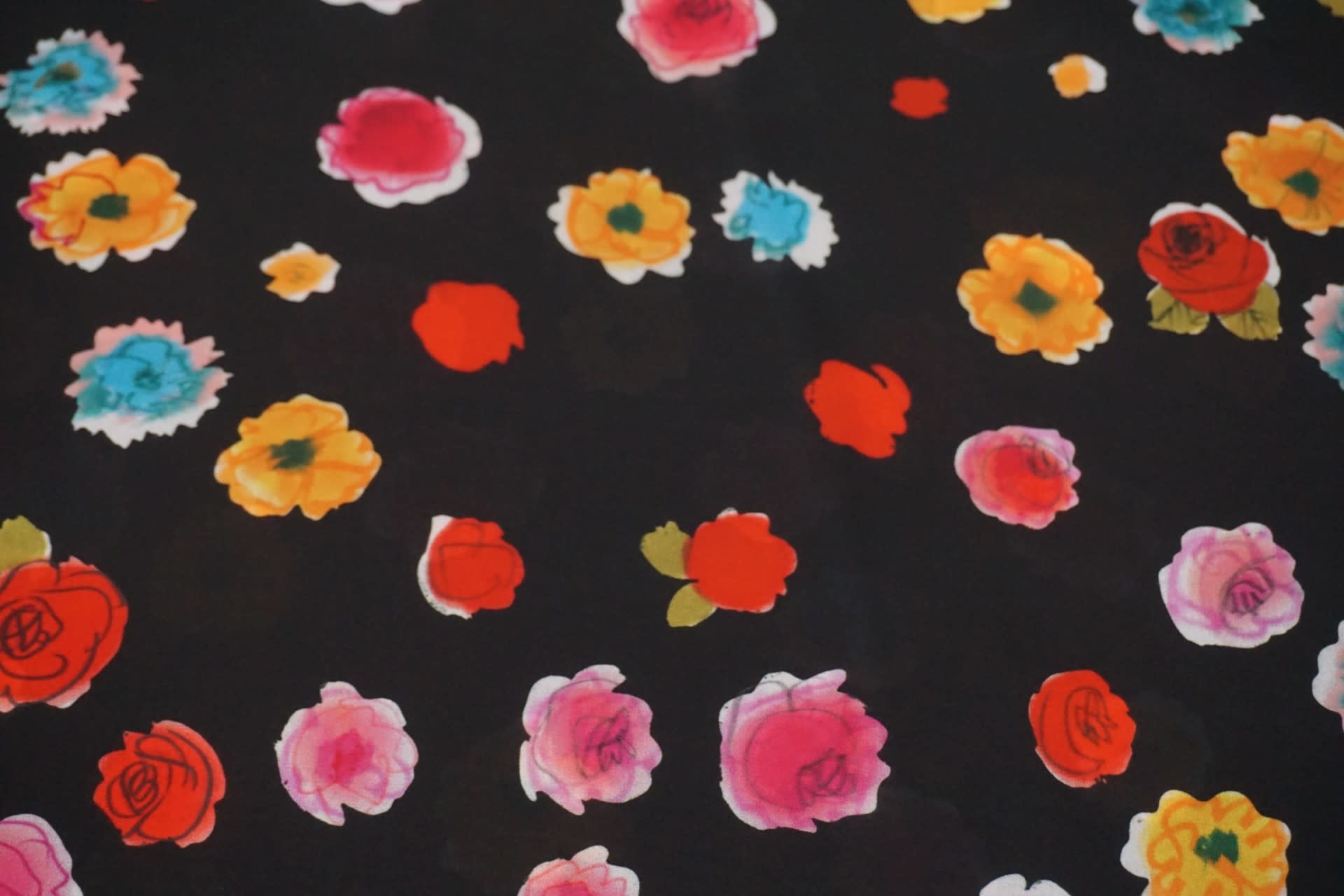 SALE Voile zwart met felgekleurde bloemen