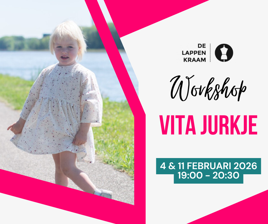 In het Atelier van De Lappenkraam starten we een nieuwe workshop voor beginnende naaisters. In twee avonden (met een eventuele derde als uitloop) maken we samen het kinderjurkje Vita van Bel’Etoile — een prachtig, veelzijdig patroon met veel variaties dat je na afloop mee naar huis krijgt en kunt hergebruiken voor meerdere kindermaten (80-164).