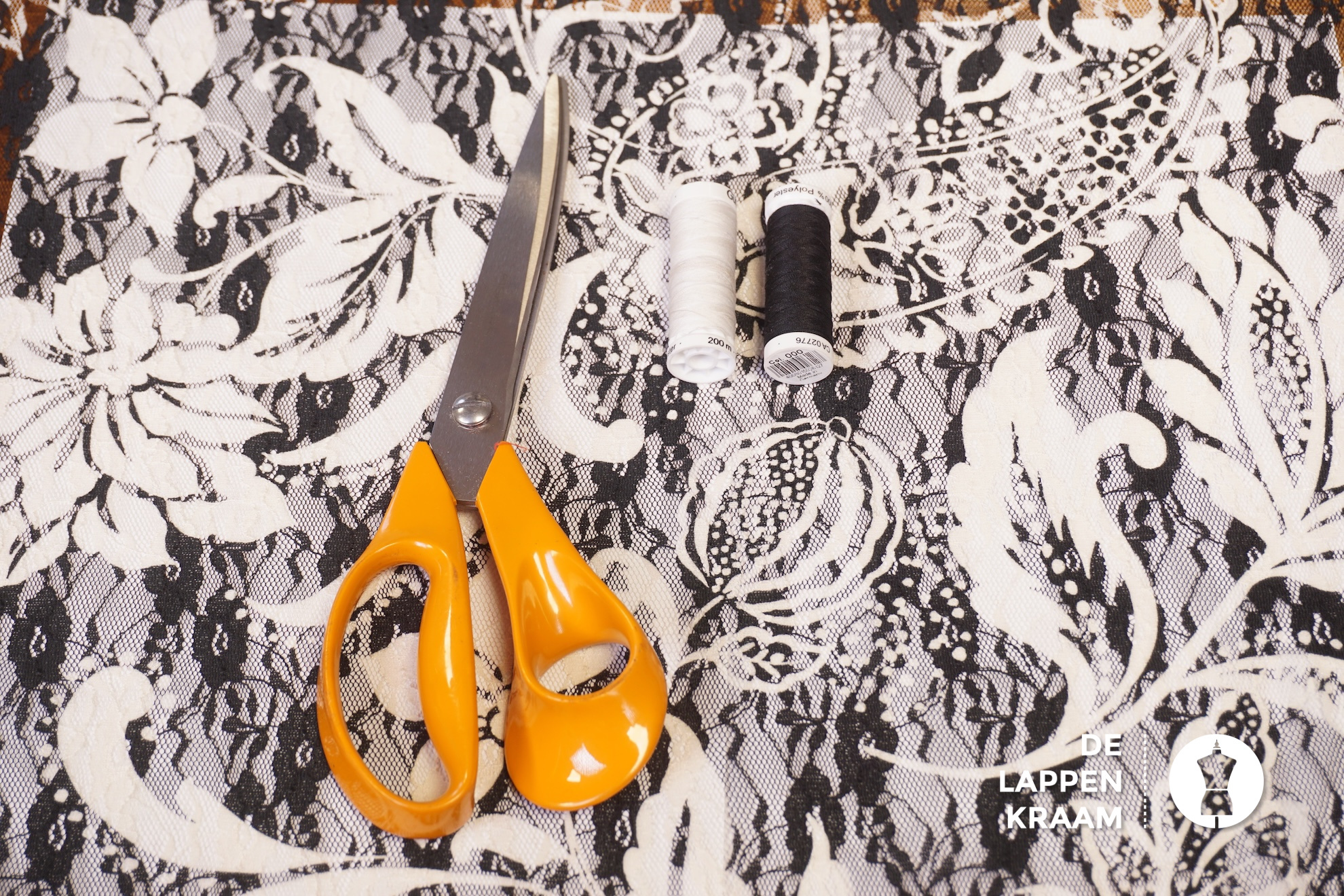 Een prachtige kant stof waarbij de grote bloemen zijn geweven in witte draden. De grote witte bloemen zijn omringd door een kleiner bloemenpatroon geweven in het zwart.... Lees meer